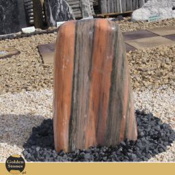 Oferujemy szeroki wybór fontann ogrodowych z otworem do wodotrysku. W składzie naszej oferty znajdziesz szeroki zakres wielkości i kolorystyki kamieni, więc prosimy o wybór osobisty pod indywidualne potrzeby i poczucie estetyki, gdyż każda forma skalna różni się nieco od siebie – tworząc niepowtarzalną bryłę. Nasze fontanny ogrodowe wykonane są z granitu skandynawskiego lub krajowego, także posiadamy gnejsowe oraz te z innych kamieni naturalnych. Wymiary kamieni wynoszą średnio od 50 do 80 centymetrów. Ich szlif jest wykonany z największą dokładnością dokładnością, porównywalną do szlifów biżuteryjnych. Dzięki temu efekt, jaki daje spływająca po nich woda idealnie podkreśla strukturę oraz nadaje płynnego połysku. Dzięki zachowaniu naturalnego kształtu skał – nasze fontanny wyglądają niezwykle efektownie nawet podczas trwania zimy. Pokryte poprzez szron jeszcze bardziej zachwycają uwydatnioną strukturą, natomiast przysypane warstwą śniegu – doskonale będą zdobić ogród poza sezonem letnim. Ten produkt to jeden z piękniejszych kamieni, charakteryzuje się pionowymi przejściami kolorów w postaci smug w barwie szarej, grafitowej i przeważającym ciemnym pomarańczu – przyrównywany do chłodnej cegły.